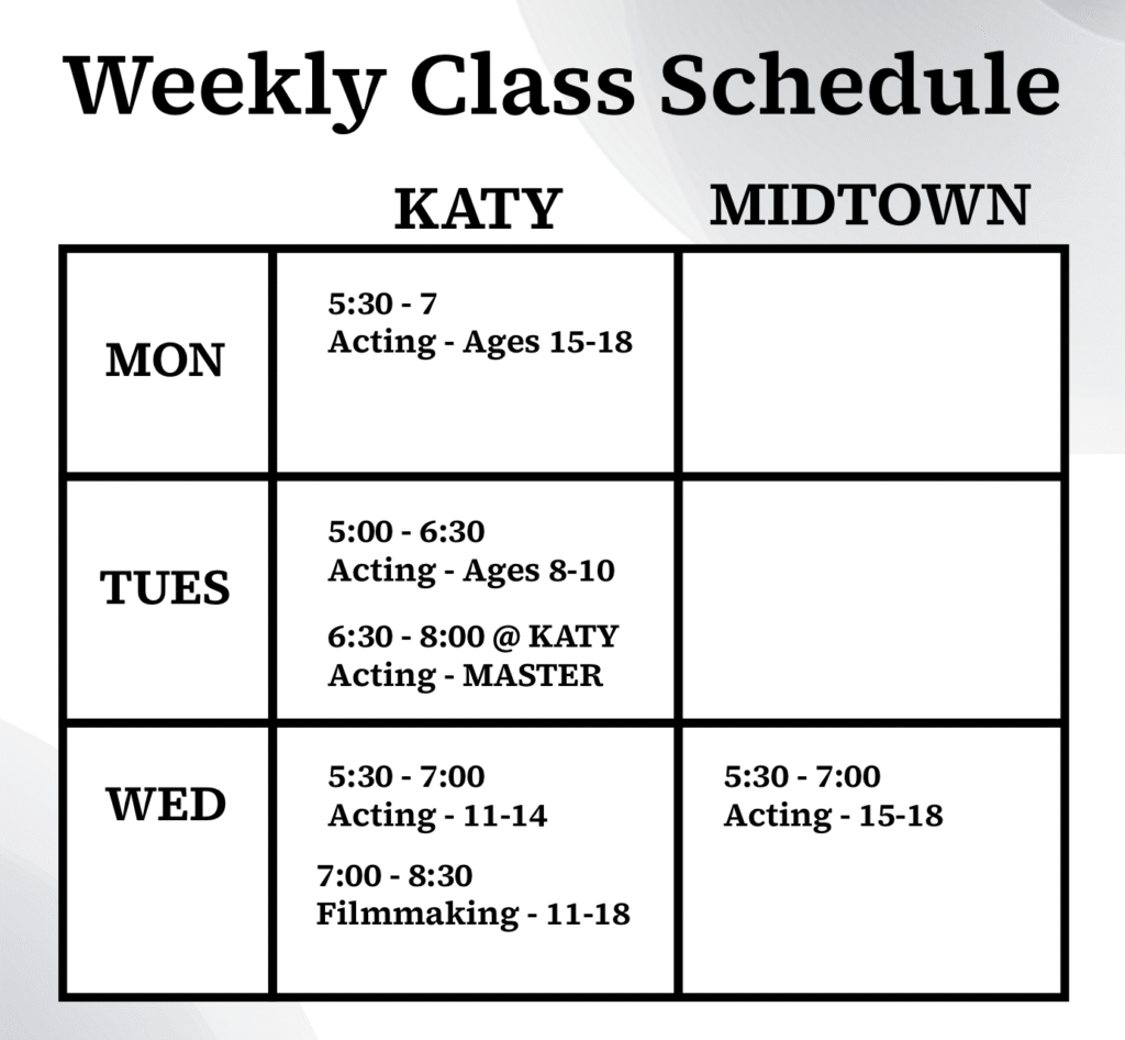 The Performance Lab is open to all students, but current Spotlight on-camera students receive priority casting and discounted tuition. Our Performance Lab classes are out our Katy location